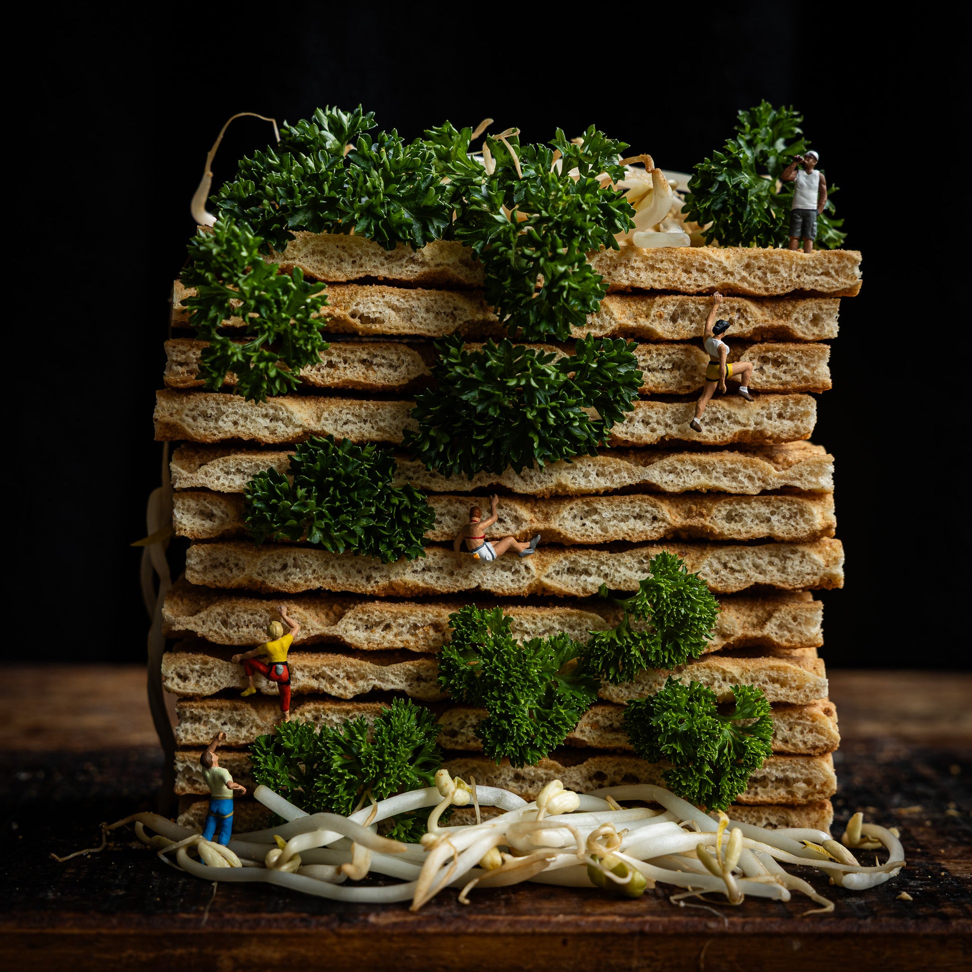 Een stapel crackers wordt beklommen door een aantal miniatuurfiguurtjes waardoor een grappig beeld ontstaat waar je even goed naar moet kijken om te zien wat er gebeurt. Deze foto, een Epson print van 40 x 40, komt goed tot zijn recht in een keuken maar kan natuurlijk overal in huis wat vrolijkheid zorgen.